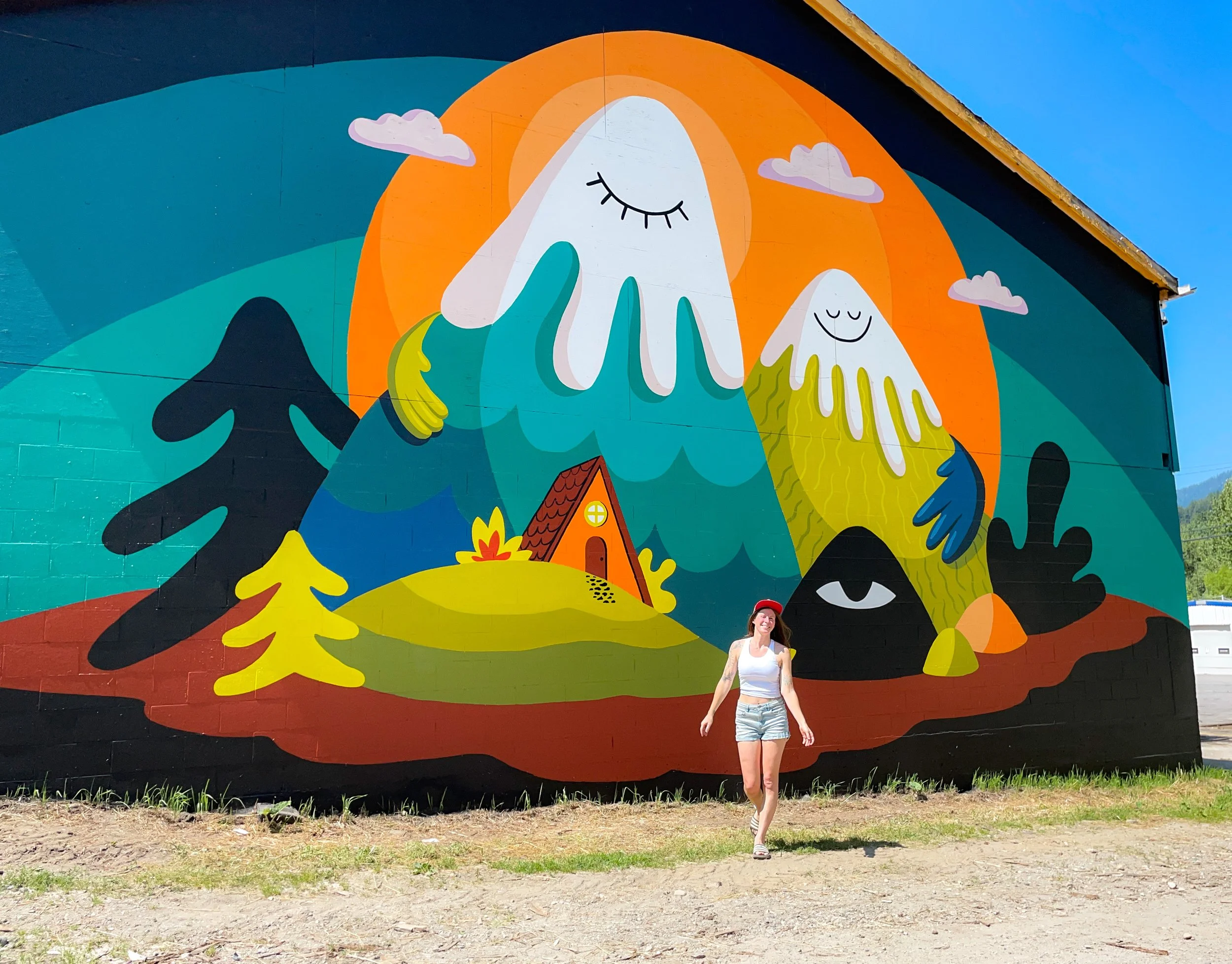 Part of the 11 artists selected for Nelson Mural Fest 2022, Bambi’s 1200 sq/ft mural can be found by Cottonwood Creek Park. Titled “You’re My Winter Flame”, the intention behind this warm & colourful piece is to spark the feeling of comfort and happiness nature brings us.
